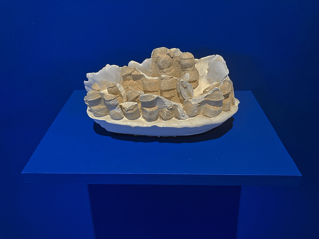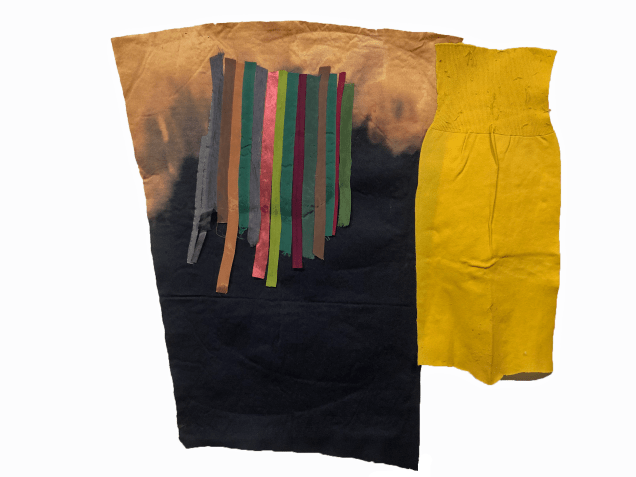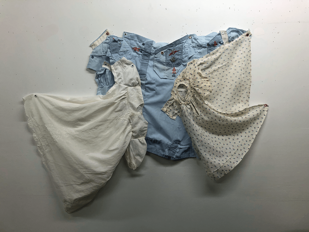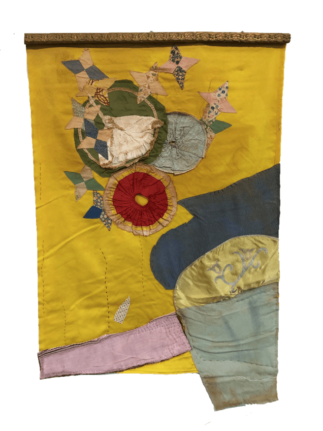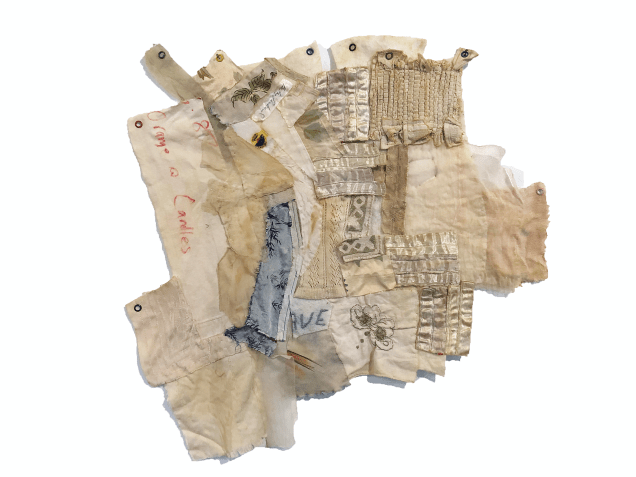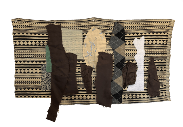 Used fabric and clothing applique. 29”x 16 1/2”. Collection of the artist.