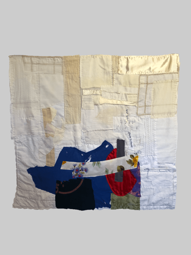 Applique and quilting with used fabric and clothing. 35″x 32′. Collection of the artist.