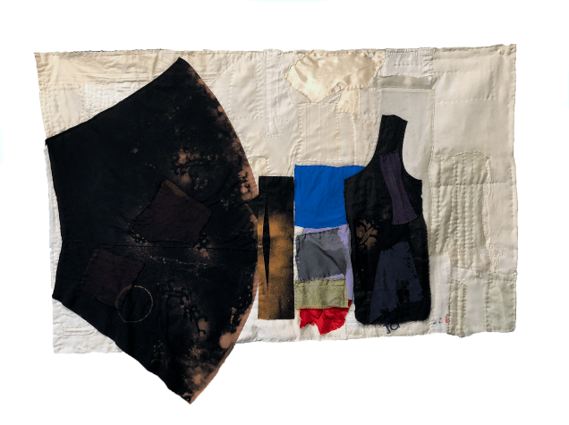 Handsewn applique and quilting with stenciled, used fabric and clothing. 47″x 35 1/2″. Collection of the artist.