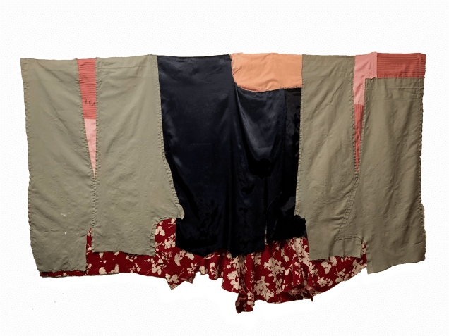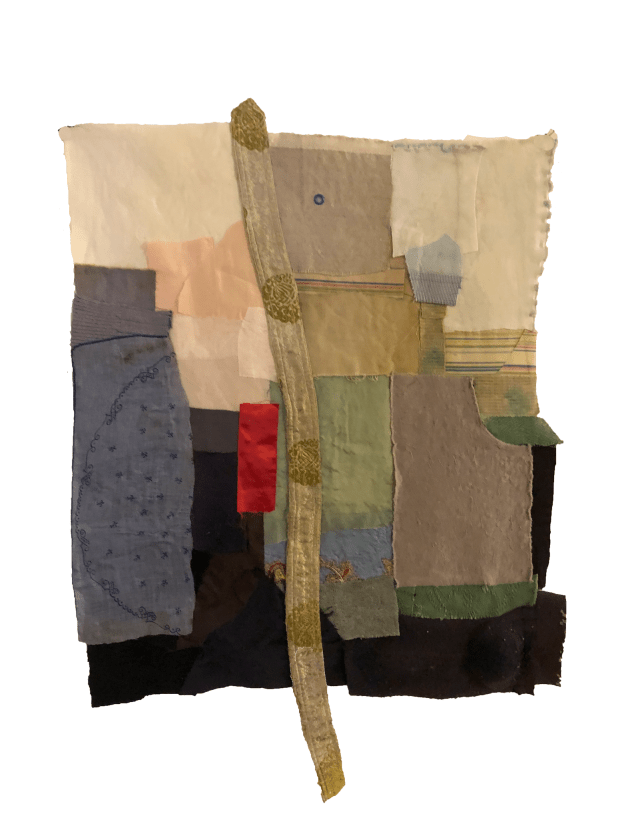 Left panel of a triptych. Used fabric and clothing. 40″x 26 1/2″. Collection of the artist.