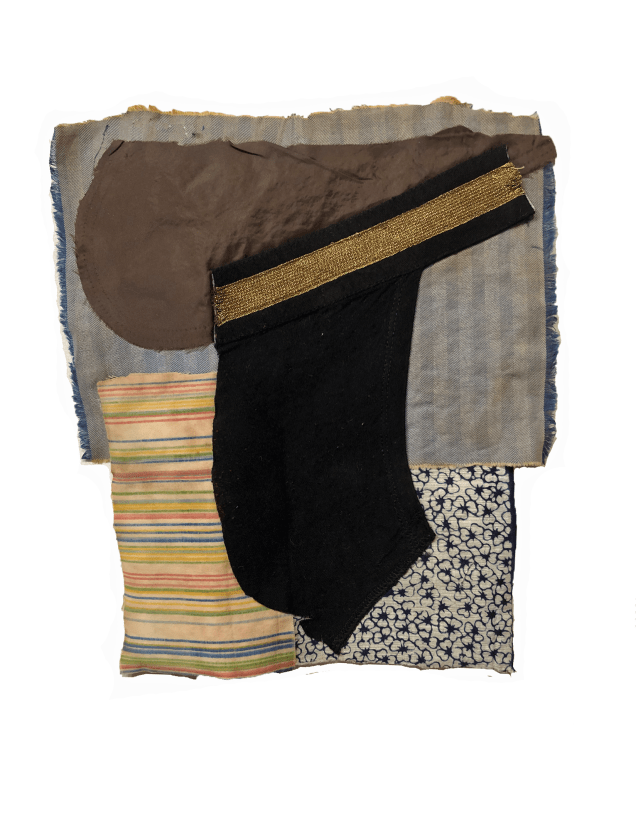 Used fabric and clothing. Fabric adhesive. 12” x 10 1/4”. Collection of the artist.