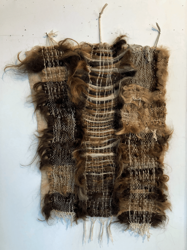 Hair, string, rice bags. 30″x 22″. Collection of the artist.