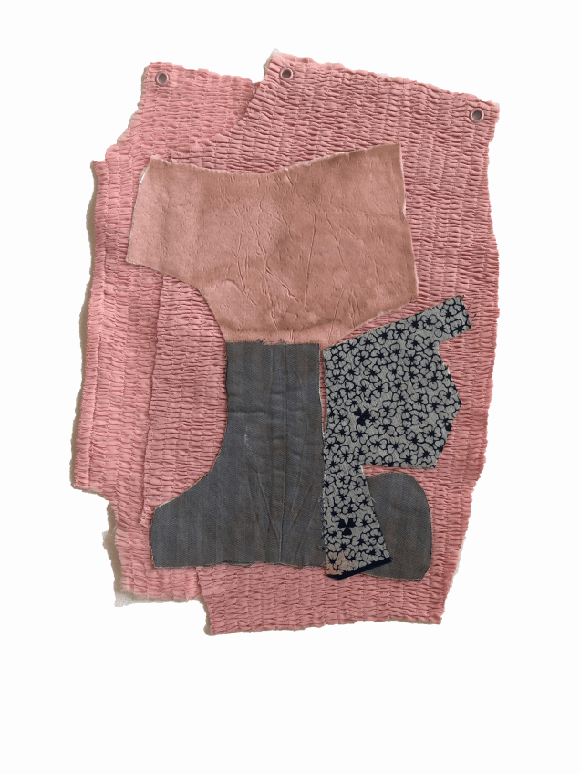 Used fabric and clothing. fabric adhesive. 15” x 10”. Collection of the artist.