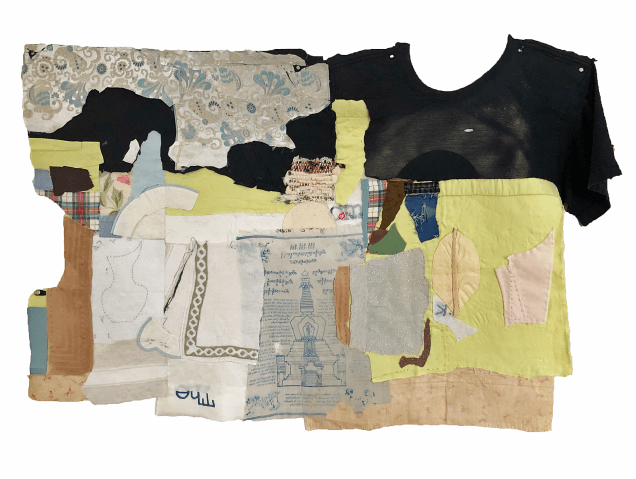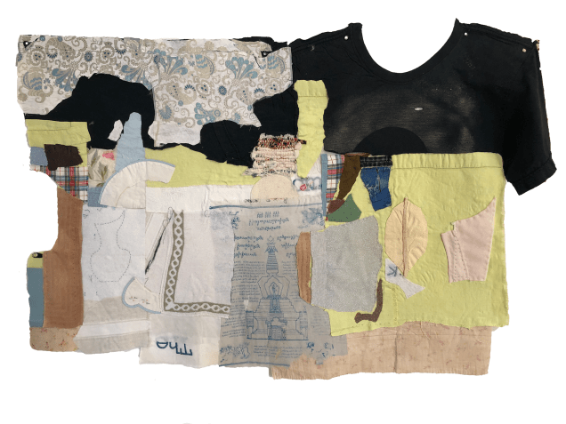 Used fabric and clothing. appliqued with hand sewing and fabric adhesive. 36”x 30”. Collection of the artist.