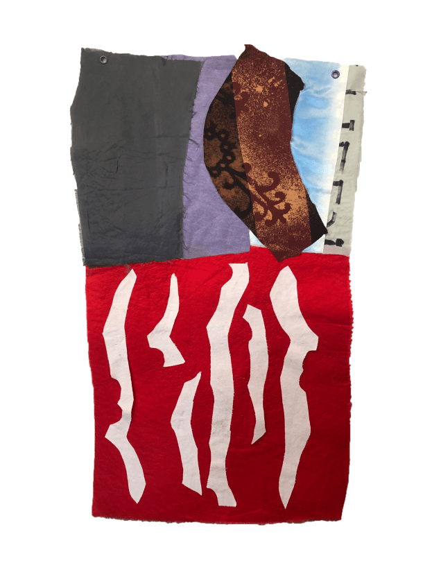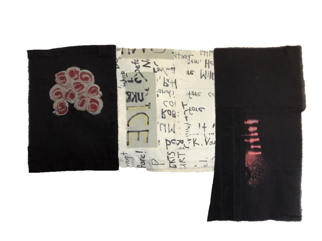 Paint, used fabric and clothing, fabric adhesive. 26 3/4 x 19 1/4. Collection of the artist.