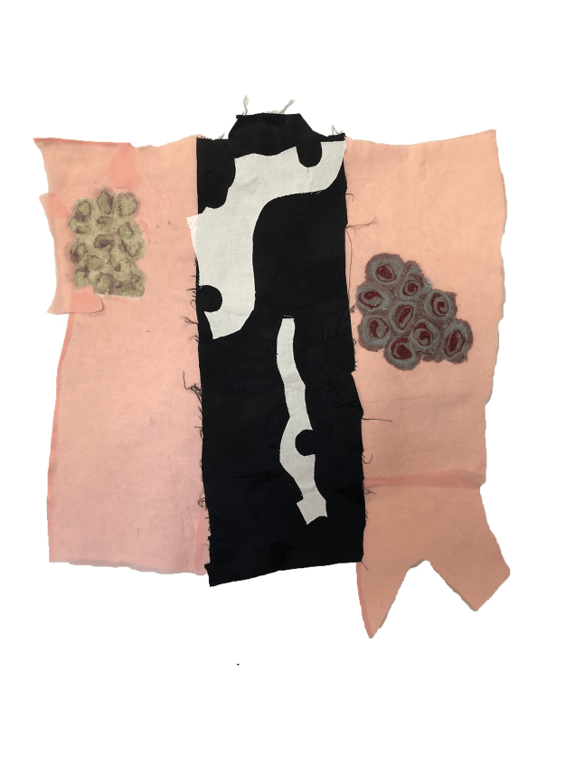 Applique with lint, used fabric and clothing; handsewing and fabric adhesive. Collection of the artist. 27 1/2”x 25”.