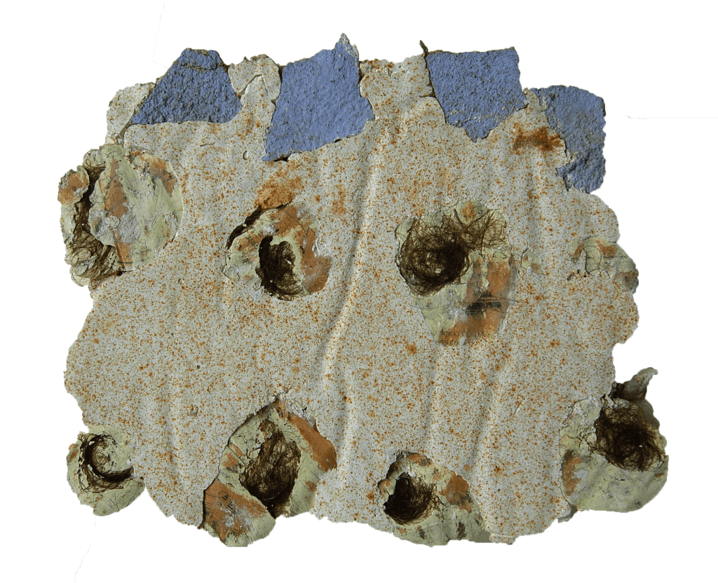 Plaster, hair, building material. 10″x 8 1/2”x 1”. Collection of the artist.