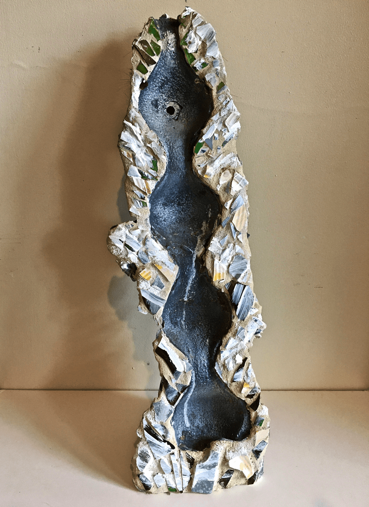 .1986 sculpture, repaired 2021. Plaster, china, glass, grout. 22″x 13″x 10″. Collection of the artist.