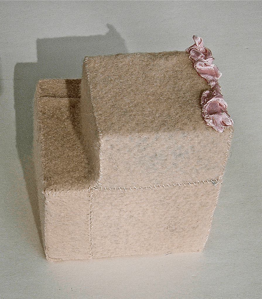 Felt and ribbon on foamcore. 4 1/2″x 4 1/4″x 4 1/4”. Collection of the artist.