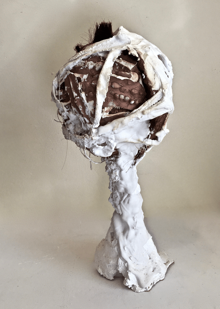 Plaster, paper, paint,hair. 16 1/2″x 10 1/2’x 8″. Collection of the artist.