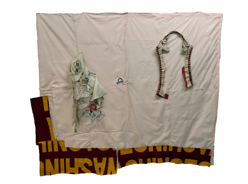 Applique and quilting, with used fabric and clothing. 42”x 36”.Collection of the artist.