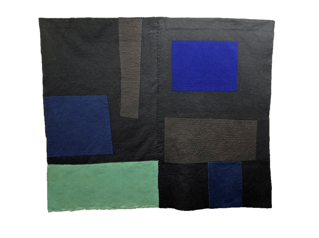 Felt and used fabric applique, quilted. 42″x 34″. Collection of the artist.