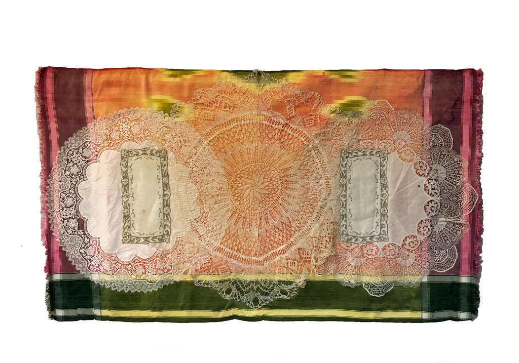 Handsewn applique on reused silk of heirloom linens (gifts from Christopher Hornig and Nancy Garruba), 53″x 31″.