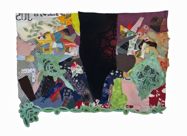 Hand sewn applique and quilting with used fabric and clothing; fabric adhesive, grommets. 22″x 19″. Collection of the artist.