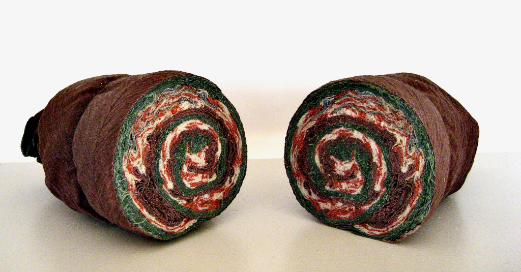 Italian Story 1978. Florentine rag/remnants, embroidered,pieced- then cut stacked, sliced. Collection of the Newcomb Art Museum, New Orleans, LA. Reusing, recycling, fabric as a primary material. Book as object.