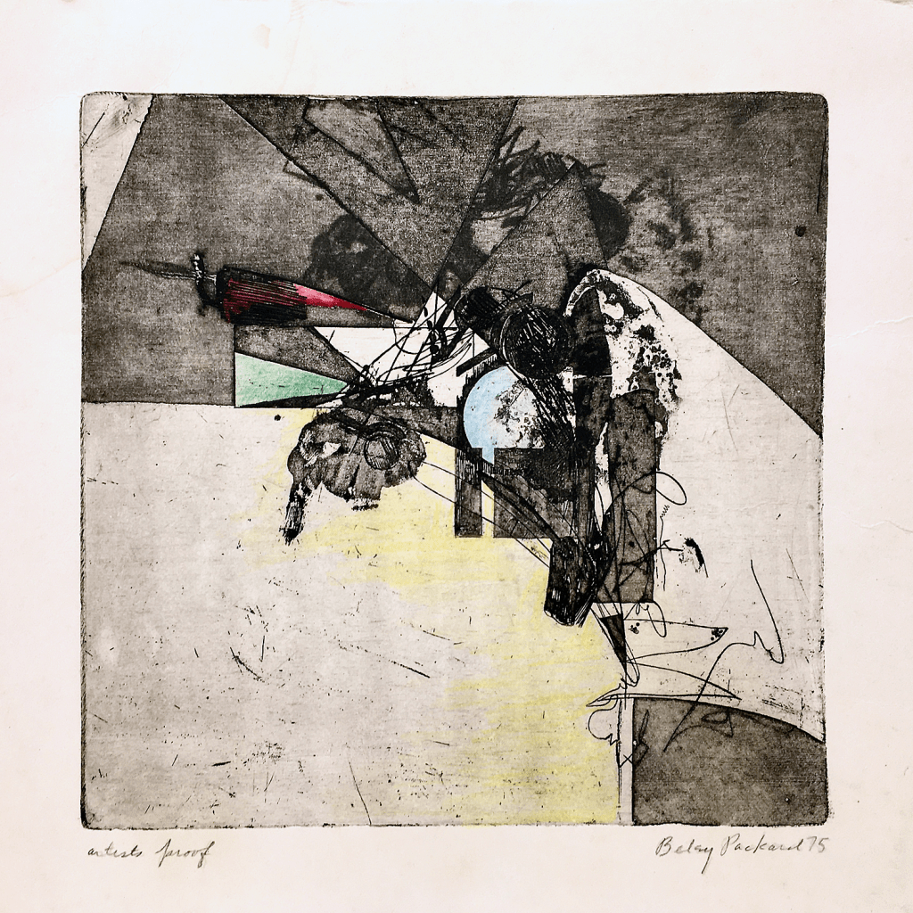 Hand colored etchings, 1975. With Drake University in Florence Italy, 1974-75– I had a class in metalwork/jewelry with Tomaso Fujimura and was introduced at the same time to etching at the Santa Reparata Printmaking Studio with Professors Dennis Olsen and Billy Ray Sandusky. In both settings I was fortunate to work in a uniquely free and casual technical environment, where my experimentation and rule breaking were not only accepted but encouraged. These experiences shaped my evolution as an artist and the way I work intuitively with materials.