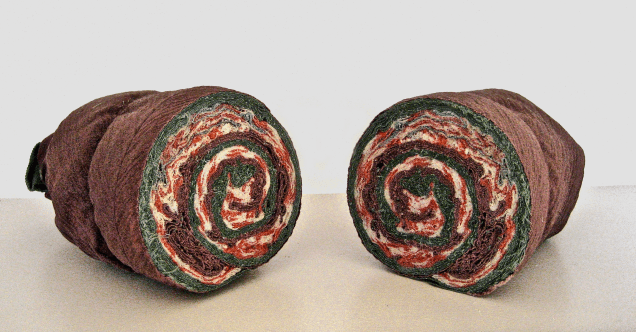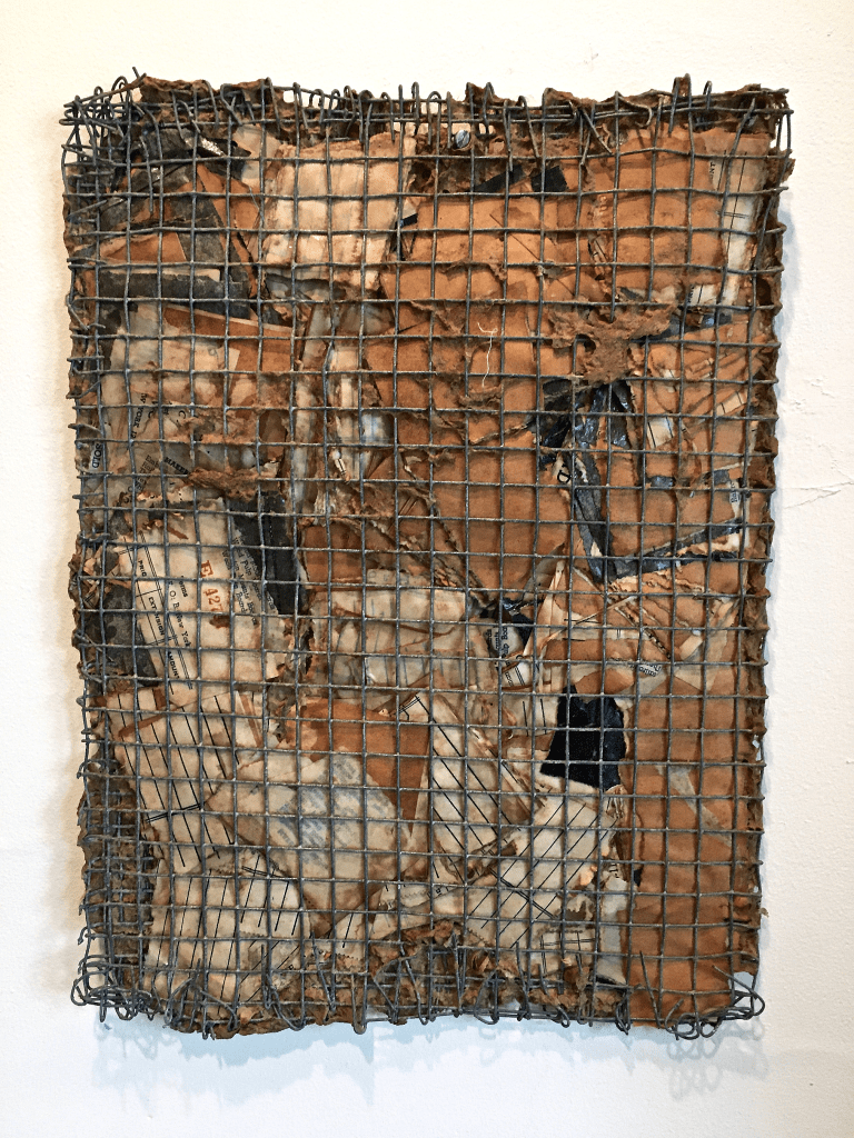Newspaper and fabric, 13″x 8″x 1 1/2″. Collection of the artist.