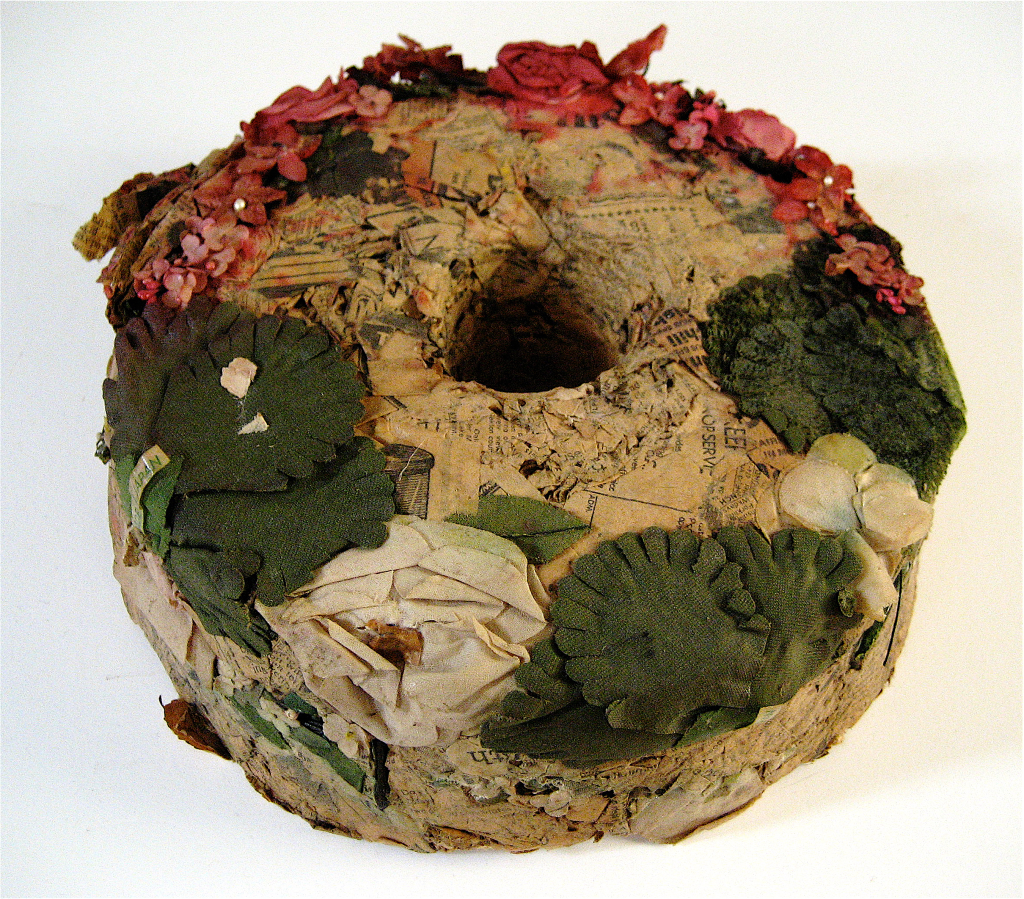 Newspaper, artificial flowers, 12” diameter 5”. Collection of the artist.