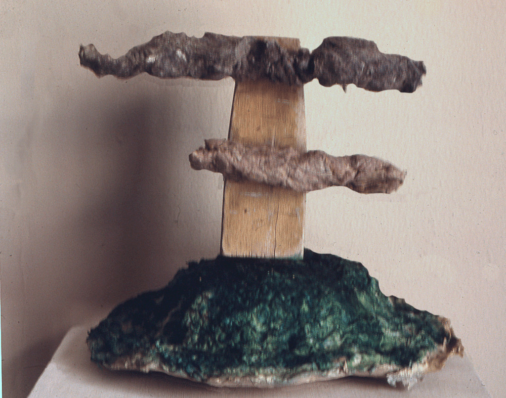 Newspaper, wood, lint , acrylic. 12”x 11”x 9”. Location unknown.
