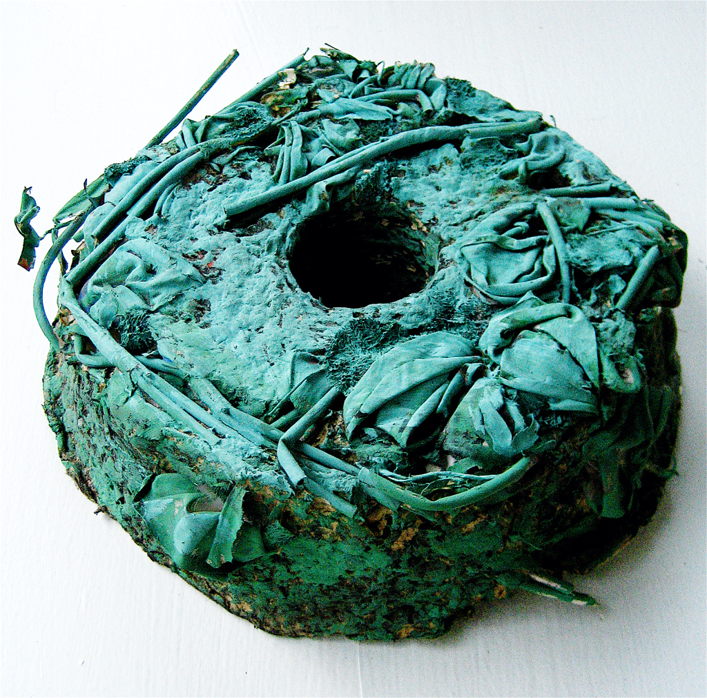 Painted newspaper, artificial flowers. 9 1/2″ diam. x 2 3/4″. Collection of the artist.