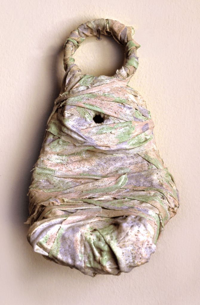 Newspaper, fabric, and paper mache. 10 1/2”x 7 1/4”x 6 3/8”. Collection of Lee Fleming.