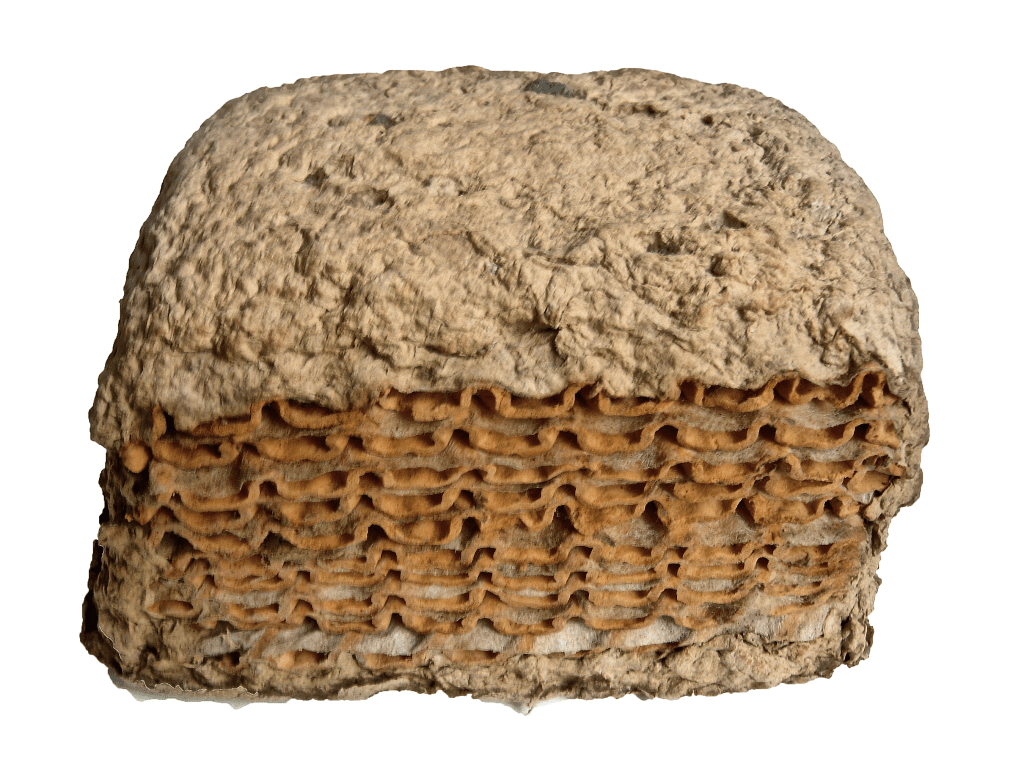 Newspaper, rug padding. 9″x 7″x 5 1/2″. Collection of the artist.