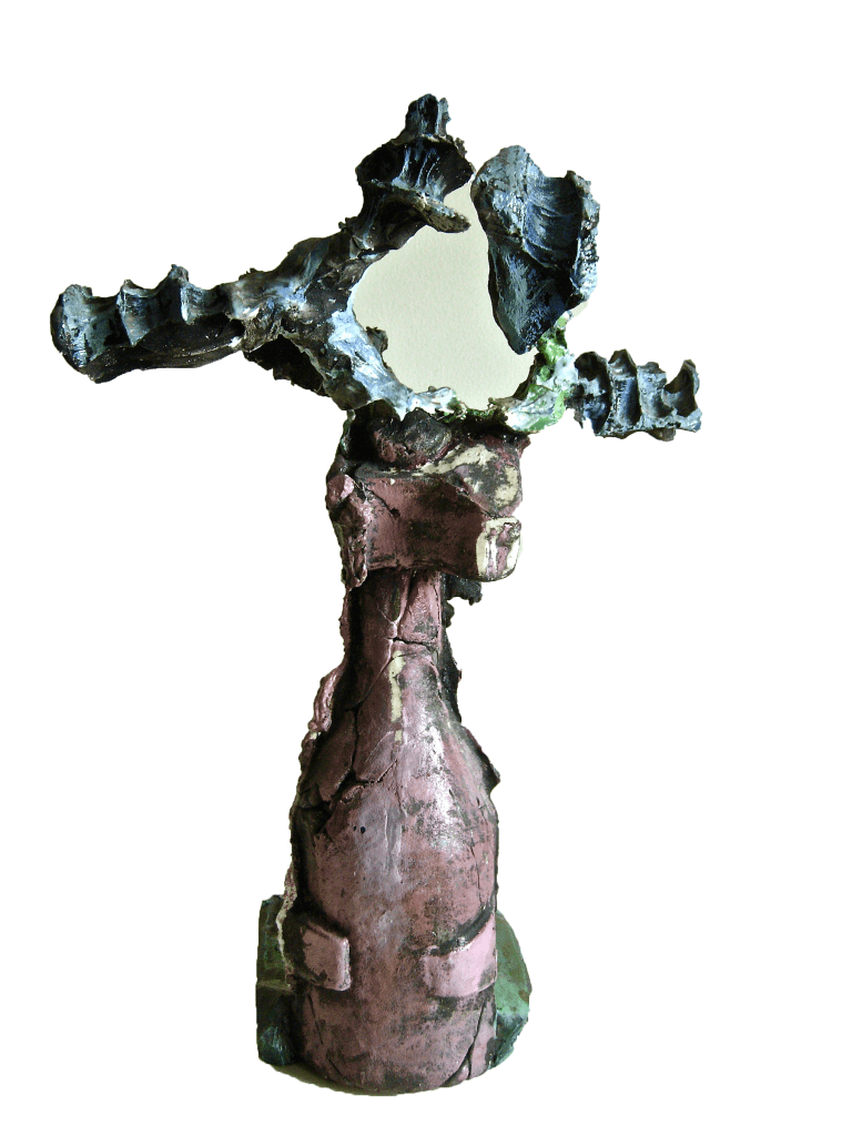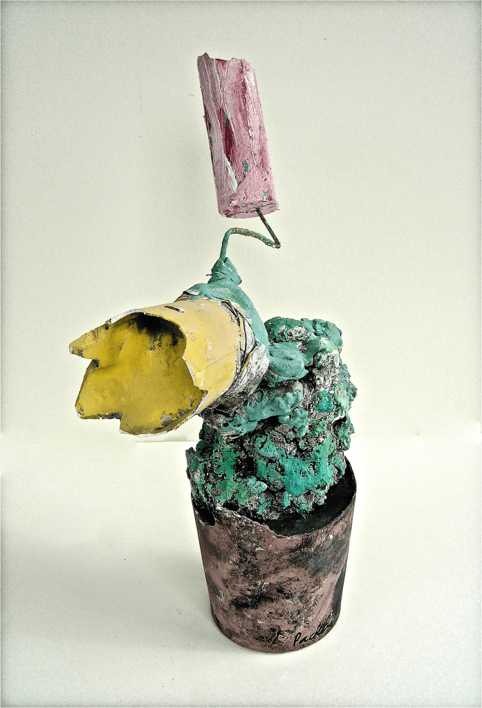 Painted plaster and newspaper. 17″x 12”x 8”. 16″x 6″ diameter. Collection of the artist.