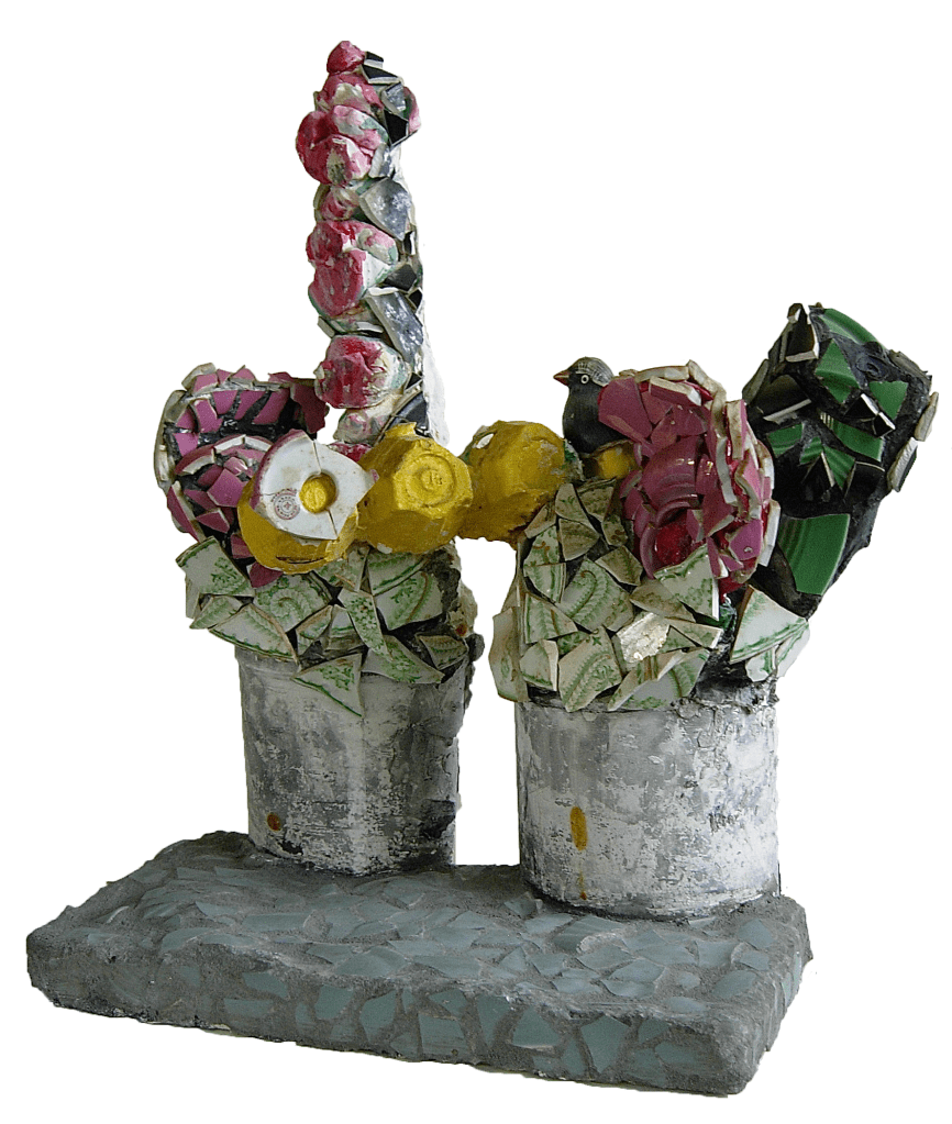 Painted plaster with china. 16 1/2”x 14 1/2”x 7 1/2” approx. Collection of the artist.
