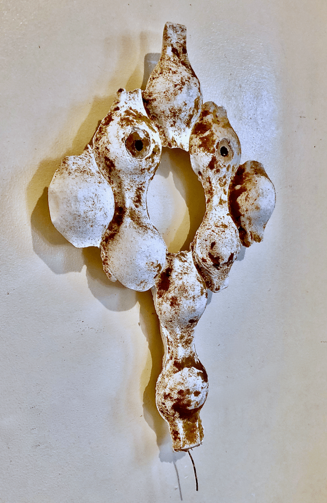 Plaster, paper residue, wood, coat hanger. 20 1/2”x 12”x 2 1/2”. Collection of the artist.
