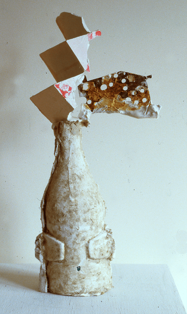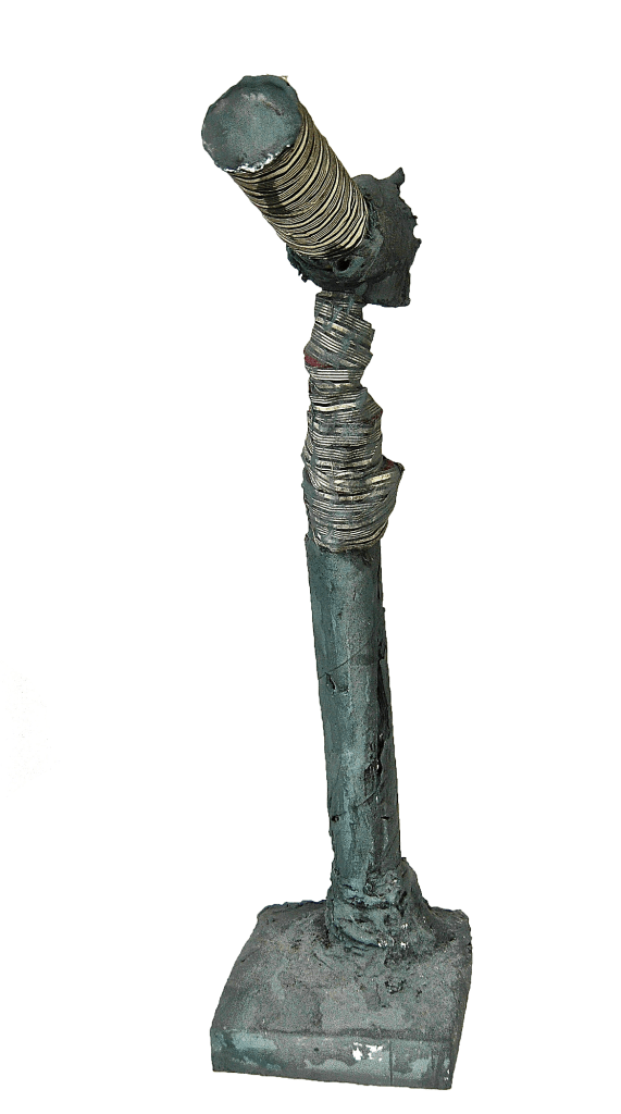 Plaster, metal, paper. 17″x 7″ diameter. Collection of the artist.