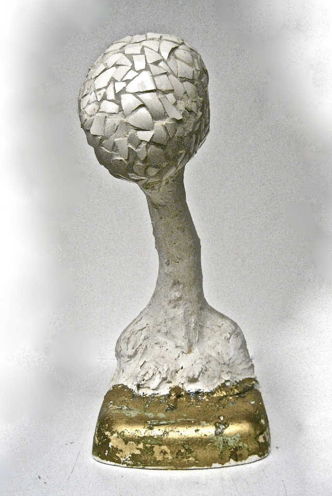 Plaster and ceramic, metallic leaf. 18 1/2″x 10 1/2″x 8 1/2″. Collection of the artist.