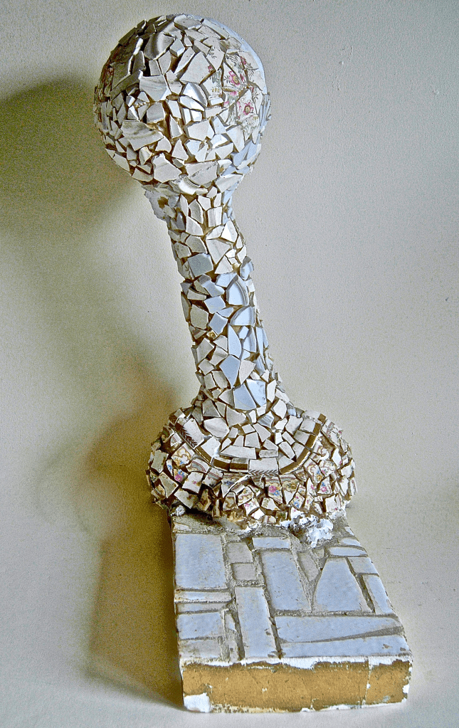 Plaster, ceramic, glass, paint. 26”x 12”x 9”. Collection of Gail Enns.