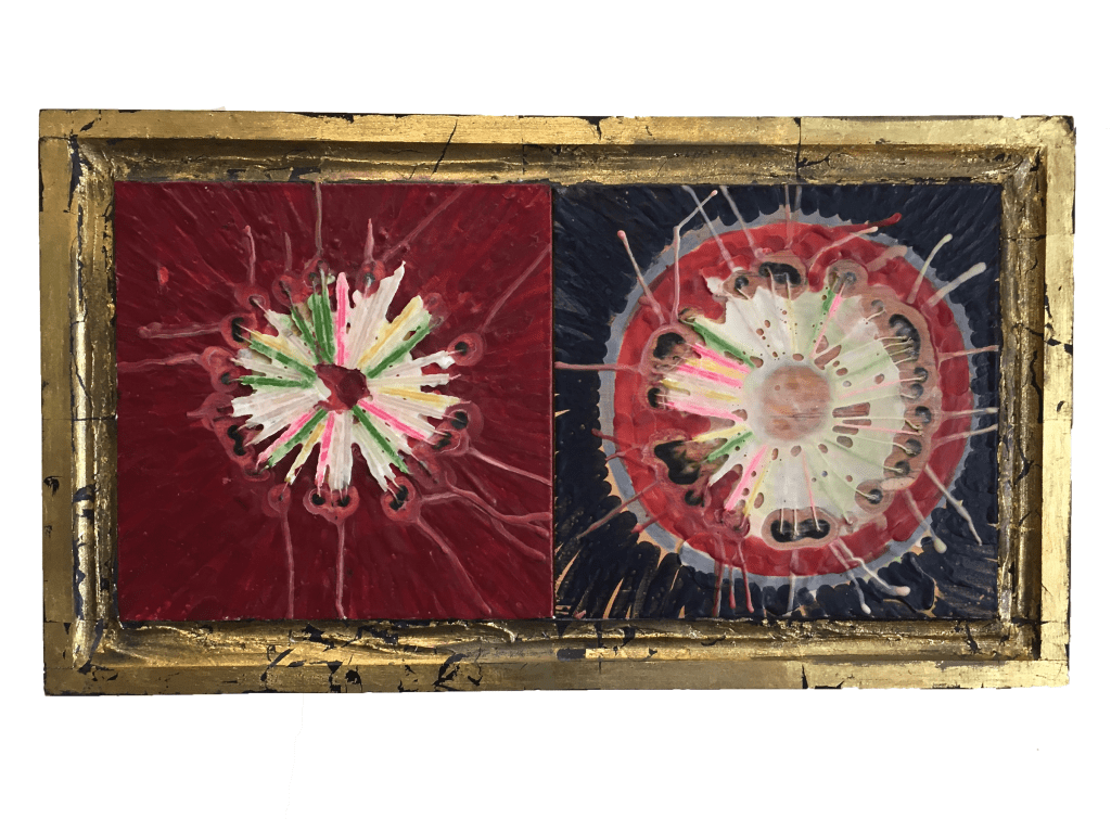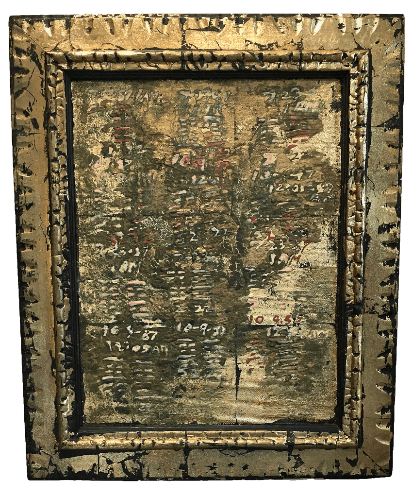 Wax, plaster, metallic leaf and glass on wood, 12″x 15″x 3″. Collection of the artist.