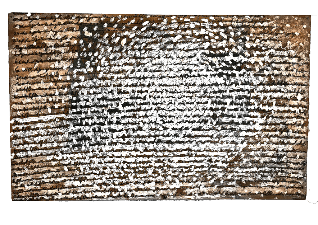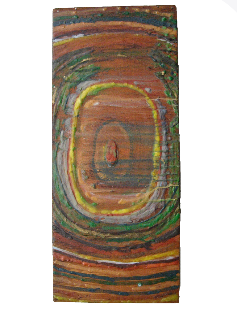 Paint and wax on burned wood. 18″x 13″. Collection of the artist.