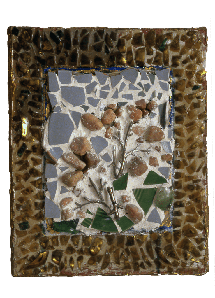 Paint, ceramic, and mirror on wood. 17″x 17″approx. Collection of Elizabeth Becker and Anthony Ruvolo.