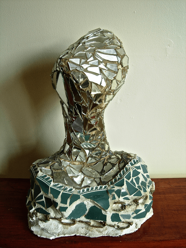Plaster, paint, mirror. 13″x 10″x8″. Collection of Raye Leith.