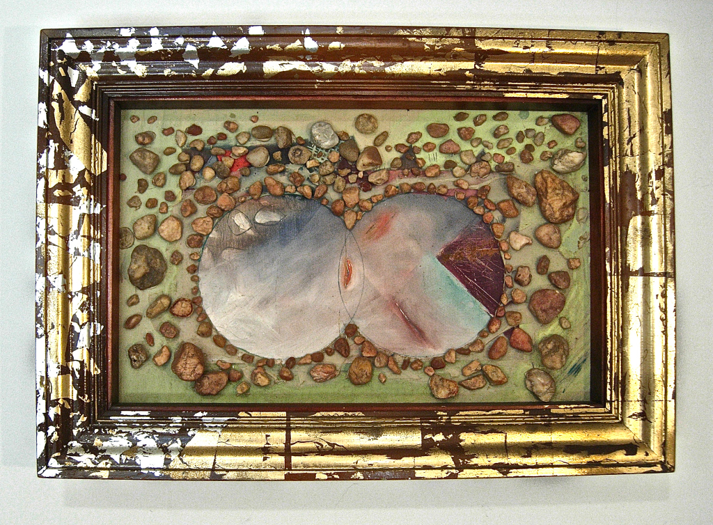 Paint and rocks on wood. 27″x 19″x 3 3/4″. Collection of the artist.