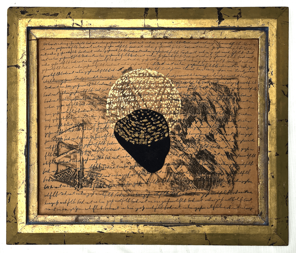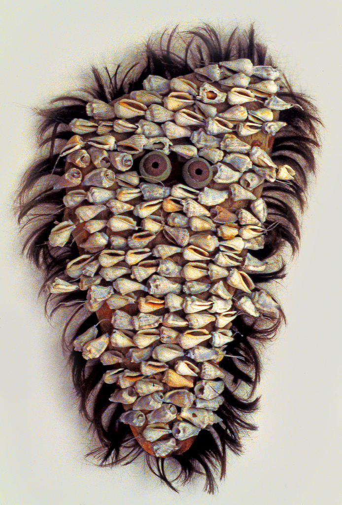 Shells, hair, beads on wood. 16”x 10”. Collection of Elizabeth Becker and Anthony Ruvolo.