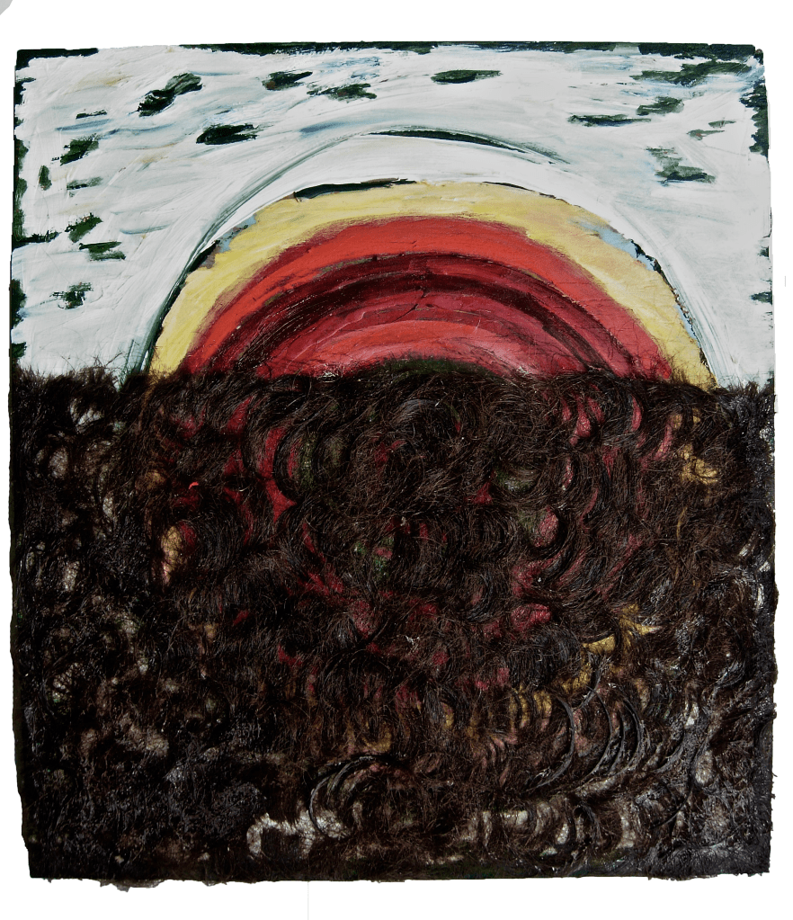 Hair and paint on wood. 19 3/4″x 17 3/4″. Collection of the artist.