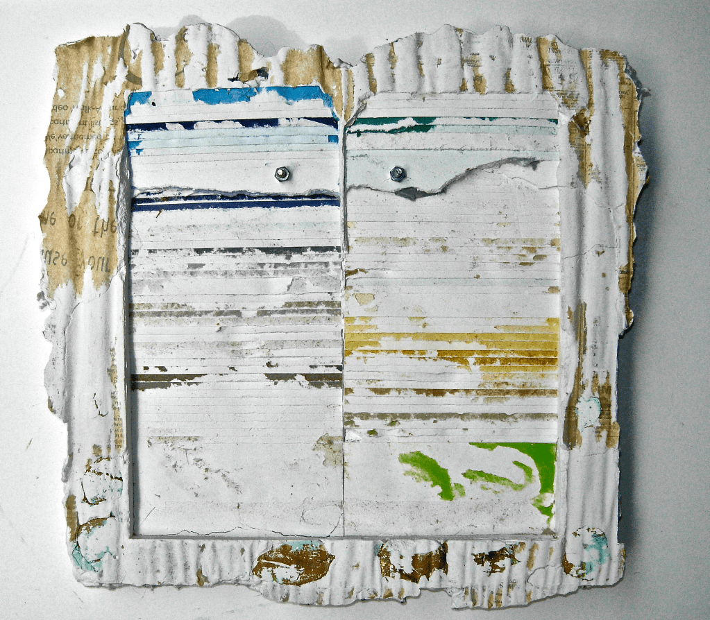 Plaster cast of colored paper, screws and washers. 15 1/2″x 15″x 3″. Collection of the artist.