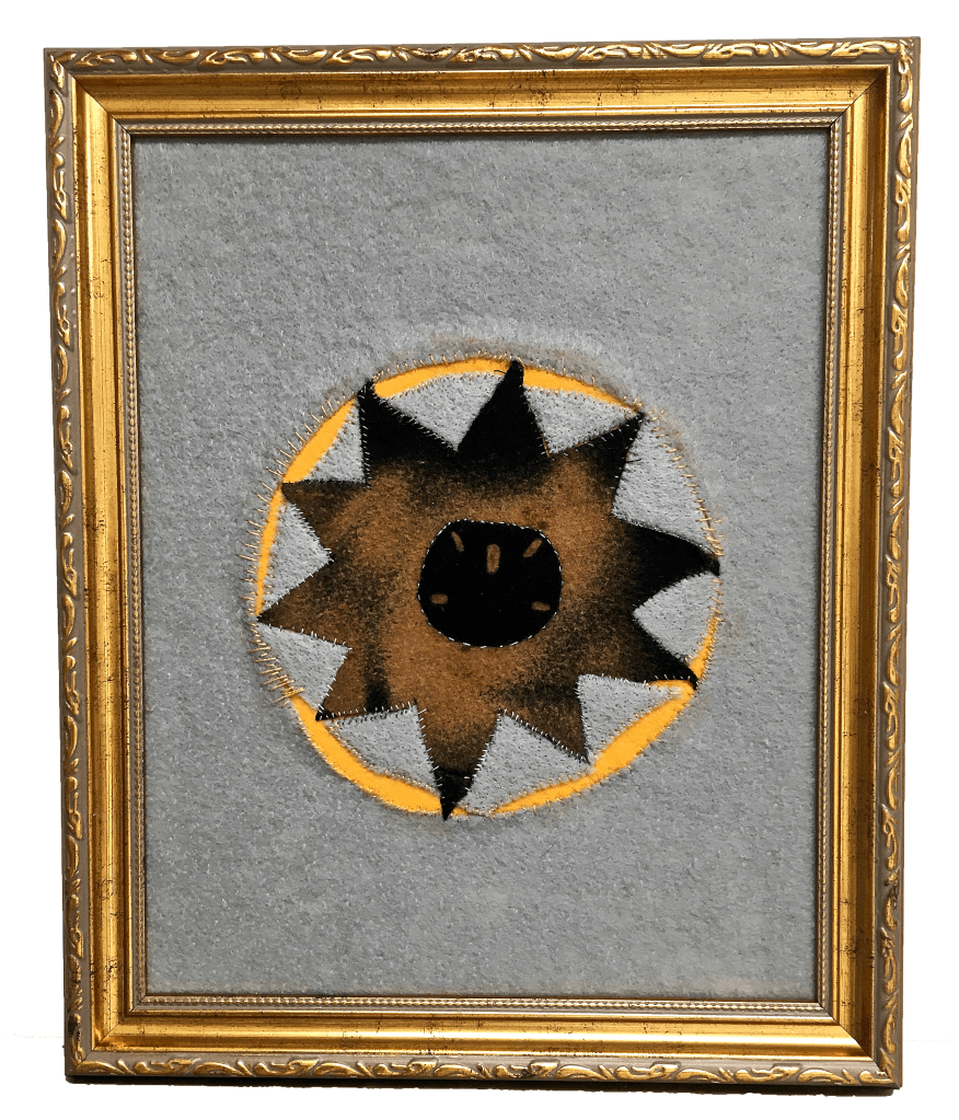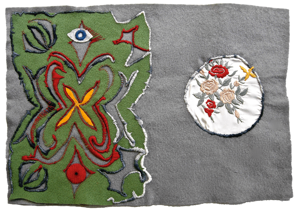 Embroidery on felt. 11″x 9 1/2″. Collection of Nancy Sausser