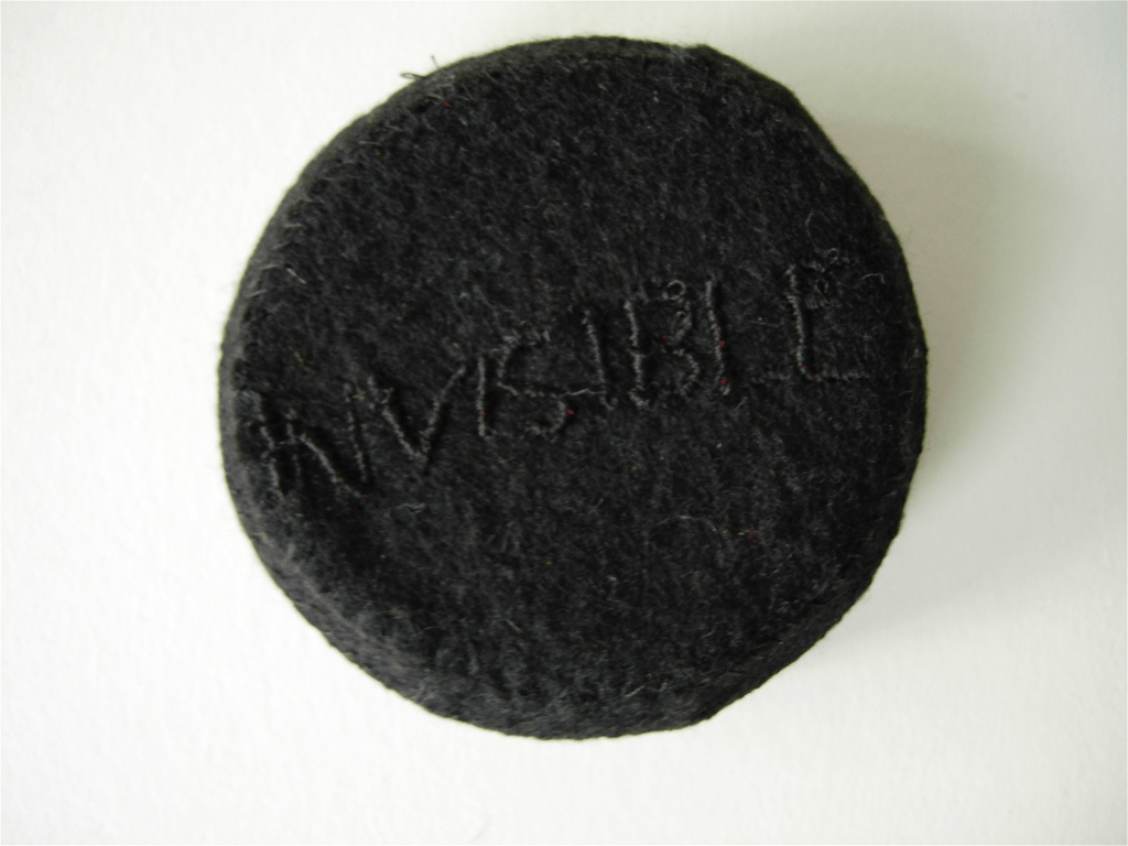 Embroidery on felt and cardboard. 1”x 3 1/4″diameter. Collection of the artist.