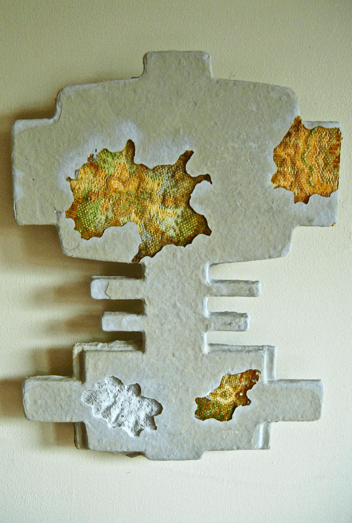 Fabric on wood. 12″x 10”x 1”. Collection of the artist.