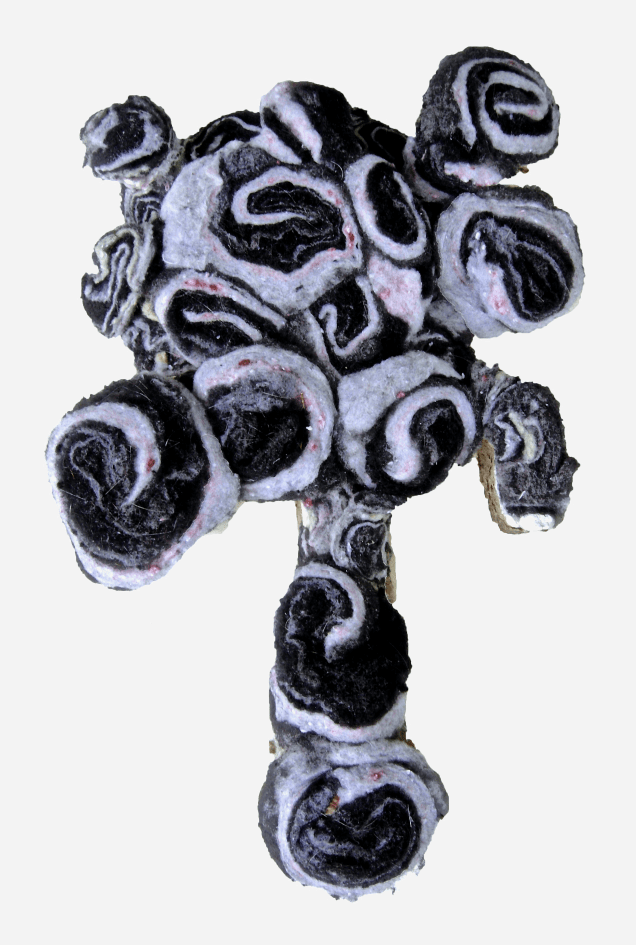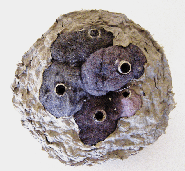 Haircolor tubes, lint, and newspaper. 4″x 6 1/2″ diameter. Collection of the artist.