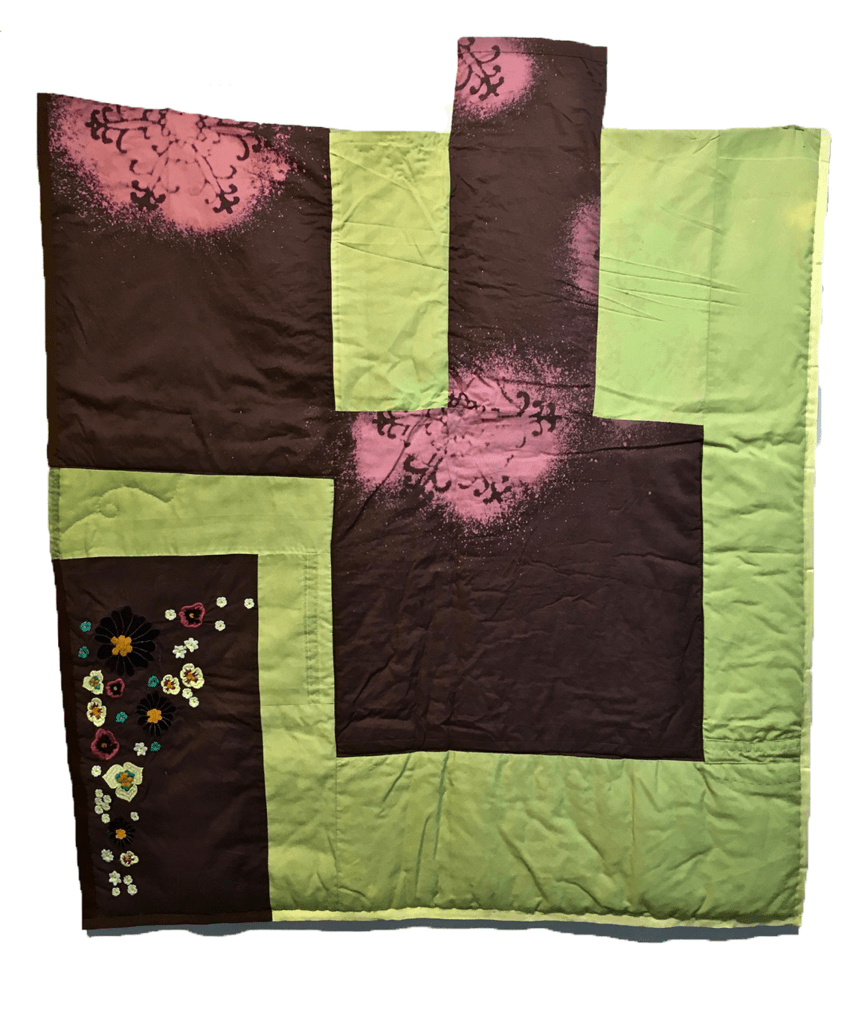 Stenciled, quilted fabric. 45″x 40″. Collection of the artist.