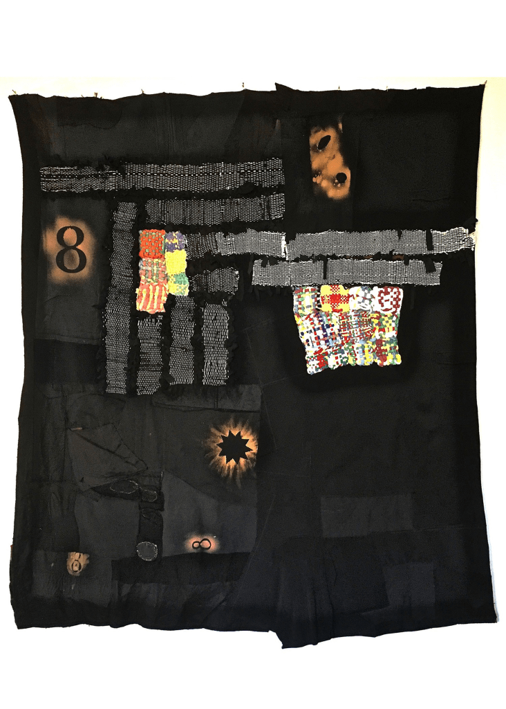 Stencil, weaving, embroidery, applique. 72″x65″. Collection of the artist.