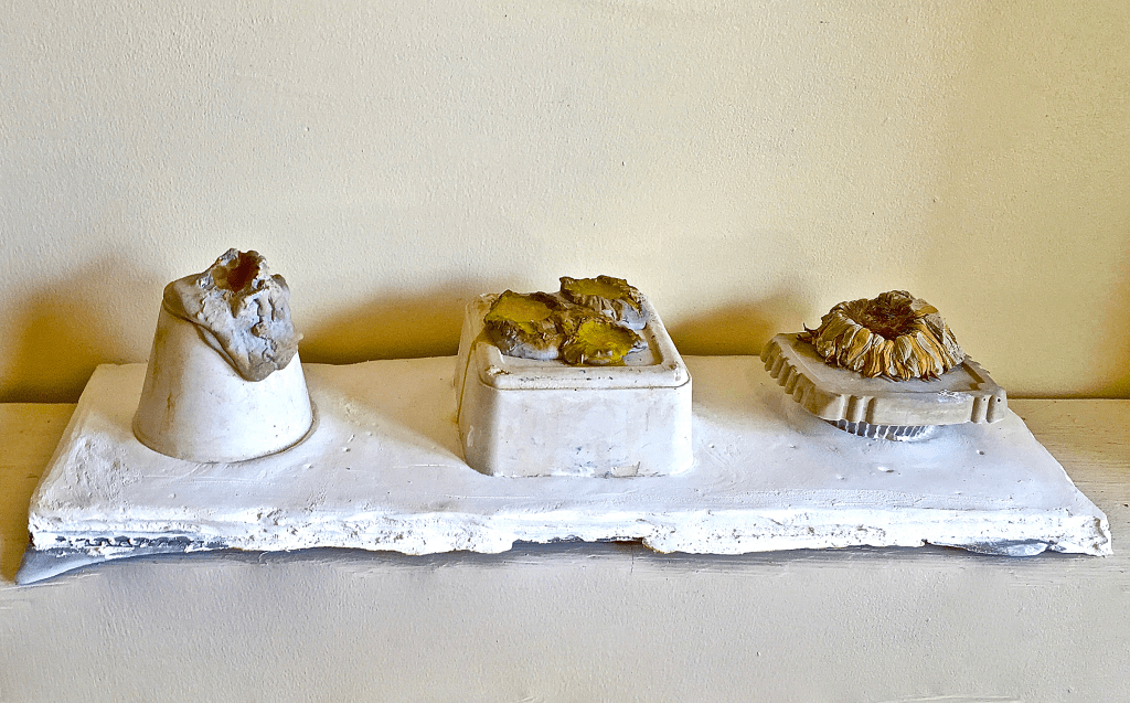 Plaster, cement, wax, flower, 20″x7″x4 1/2″. Collection of the artist.
