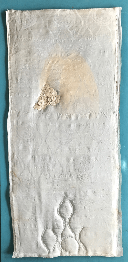 Iron burn marks, buttons. quilting. 29 1/2″x 14″. Collection of the artist.
