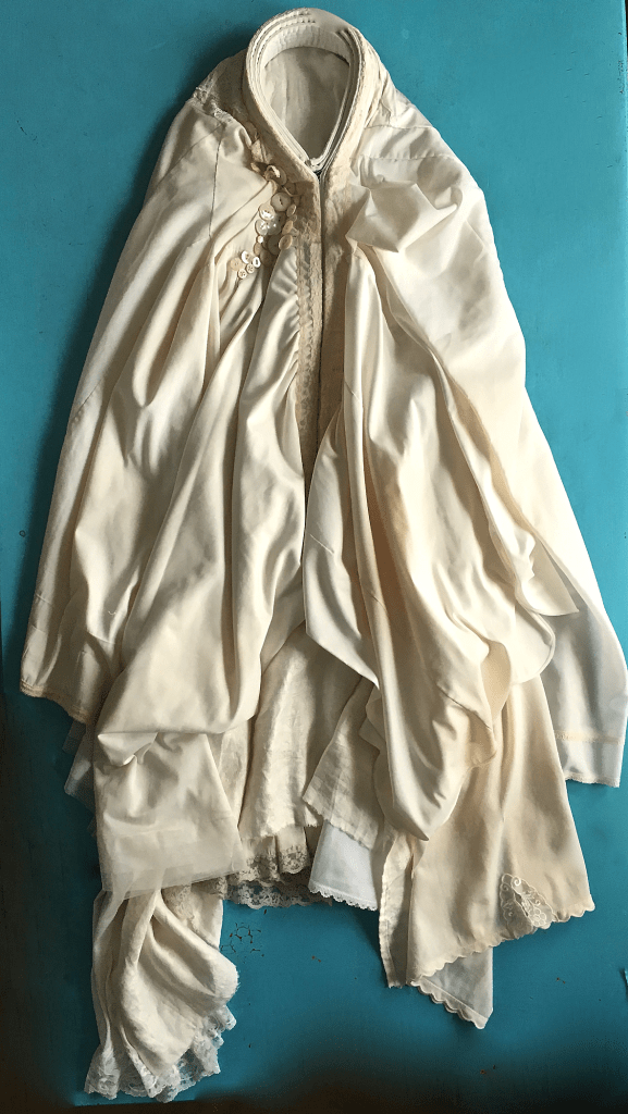 Slips, shells, lace, buttons. 52″x 27”. Collection of the artist.