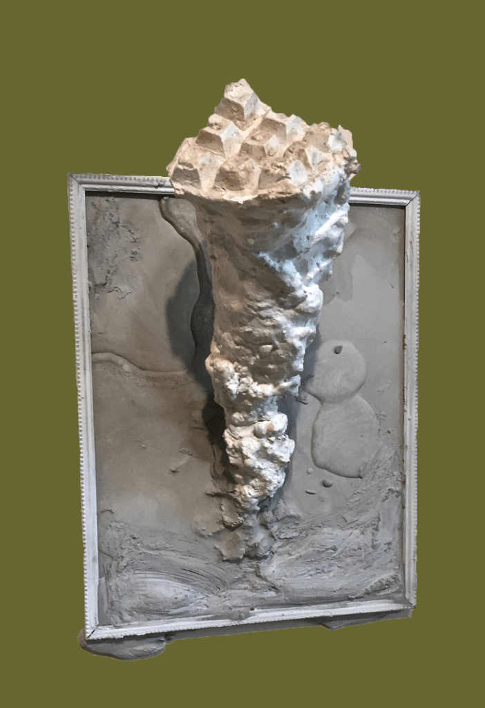 Cement in wood frame. 8 1/2″x 6 1/2″. Collection of the artist.